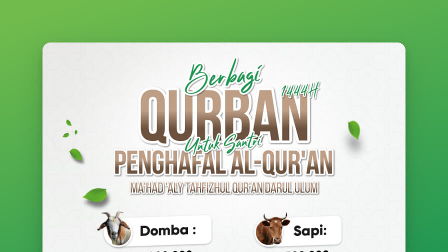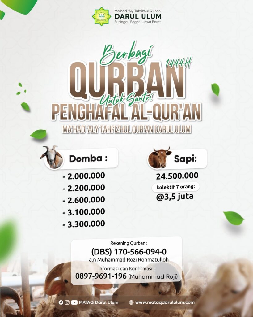 Ma'had 'Aly Tahfizhul Qur’an Darul ‘Ulum memberikan peluang kepada Bapak/Ibu para walisantri dan juga para muhsinin untuk berQurban di pesantren Darul Ulum pada Idul Adha 1444 H ini.
